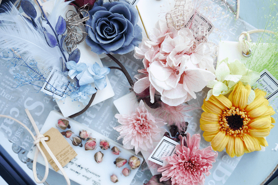 お花やリボンなど、思わず手に取りたくなる可愛いアイテムをぎゅっと詰め込んだ作品たち。